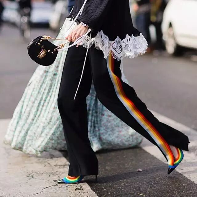 各个大牌都争相推出“校服裤”。Chloe今年的春夏系列就有,其中的彩虹条纹还是街拍中的爆款。▼