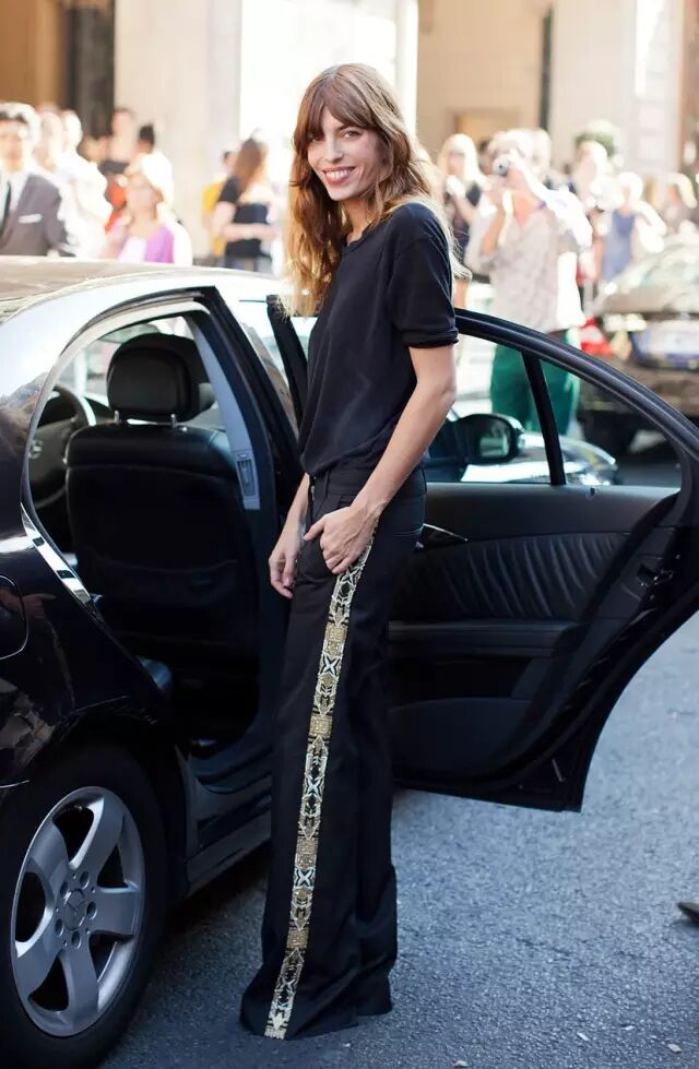 Rosie这身就是校服裤穿去上班的时髦标配:搭配小西装、一字带高跟以及一个方正的上班包。▼