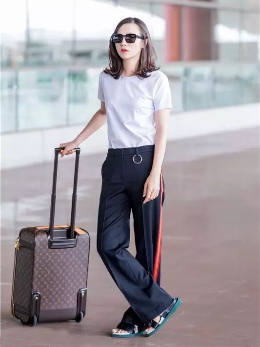 像宋佳这样搭配一件最简单的基本款白T恤去机场,休闲感十足。▼