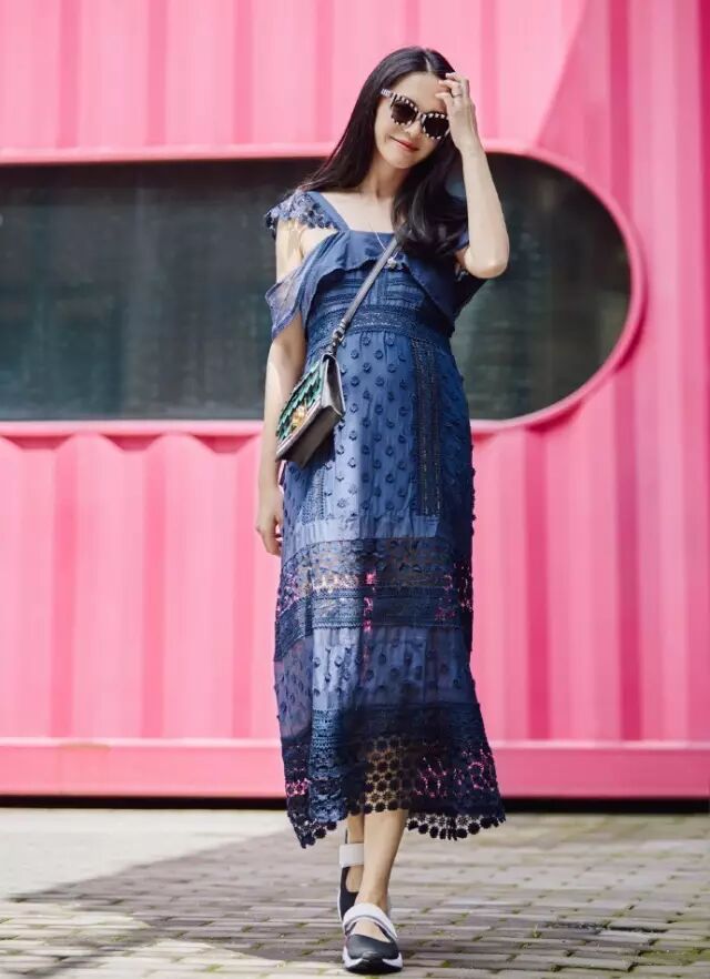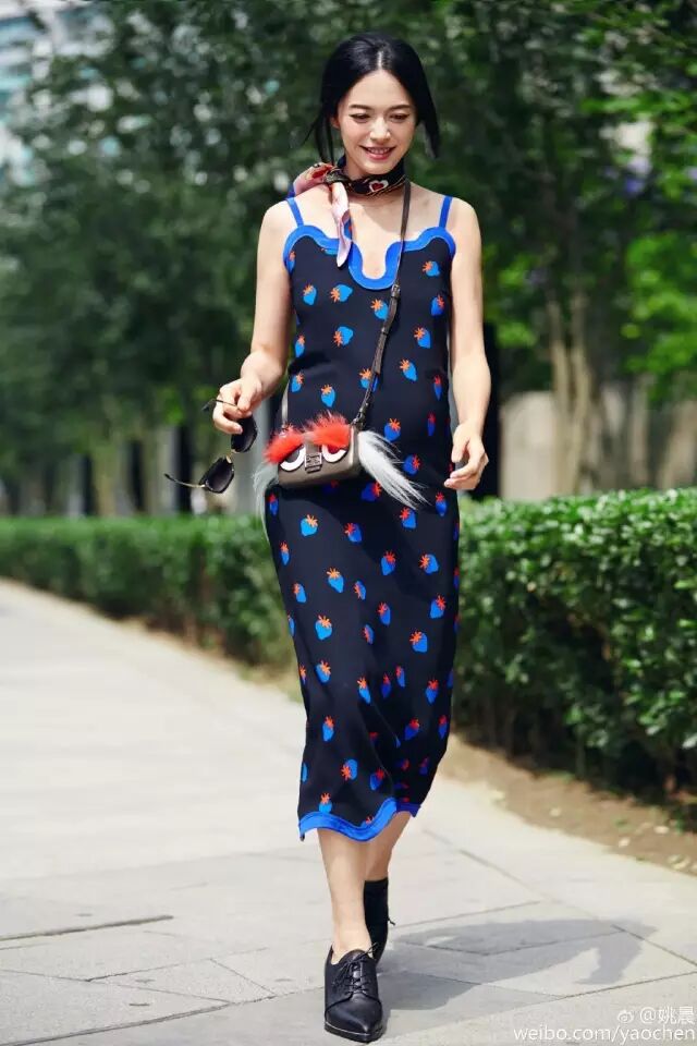 姚晨这条藏青色连衣裙更适合普通孕妈,出席个正式点的场合也丝毫不怕被艳压。▼