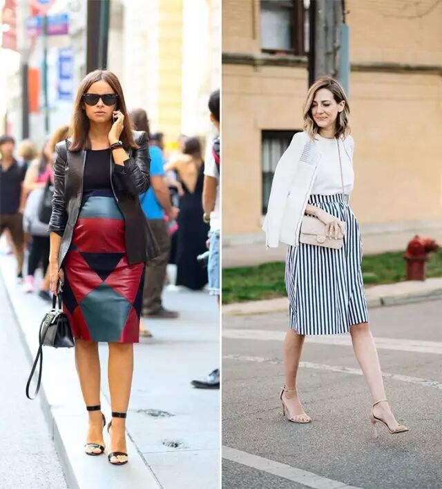 如果选择半身裙,高腰的款式也可以达到和腰带同样的效果。对比一下,选择更宽松一点的半裙会更好看。▼