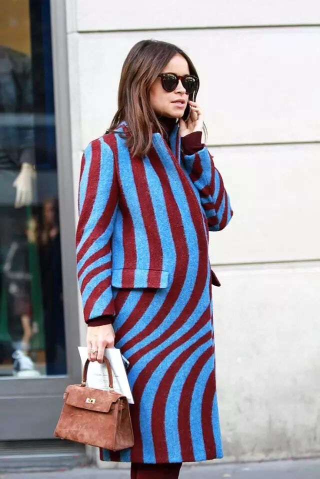 红棕色和蓝色条纹大衣,极具冲击力的撞色,气场强大到没朋友。▼
