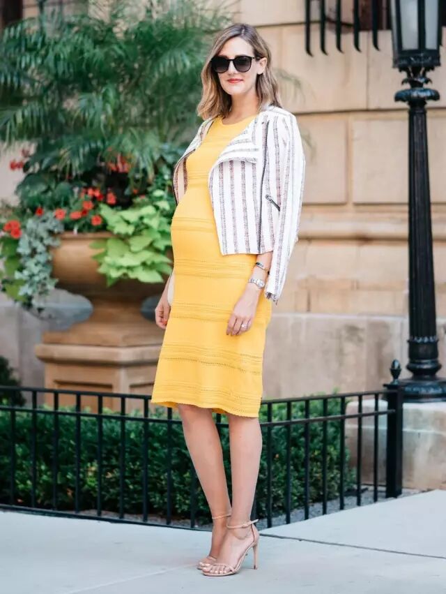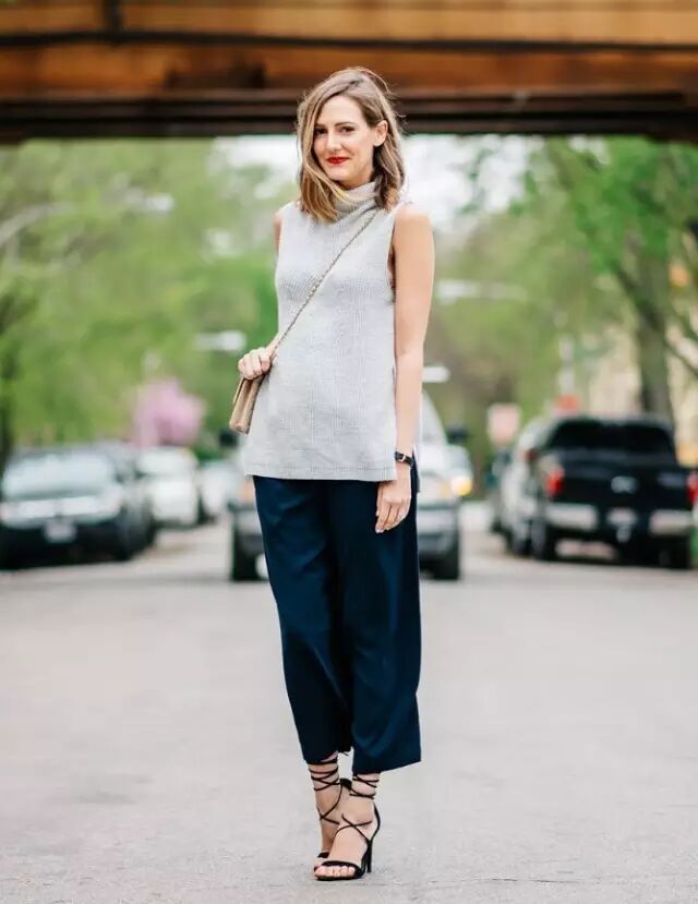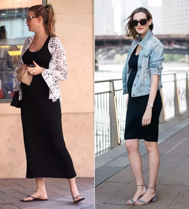 有些人怀孕后腰身不再明显,如果再加上水肿和发胖,整个人很容易变成一个圆柱体。这时,提高腰线营造曲线,在视觉上达到纵向延伸的效果就很有必要啦。