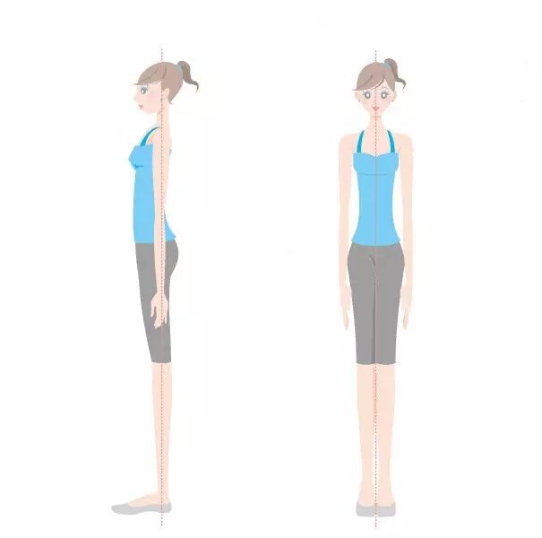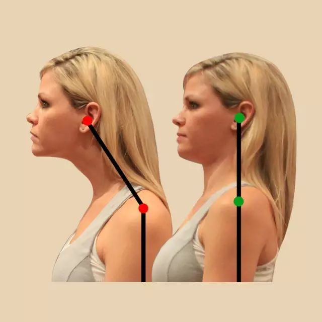 看完上面的图,应该已经知道什么叫做脖子前伸吧。很多人总是在不经意间就会把头和脖子往前伸,一般耳朵在肩部前就算是前伸了。如果脖子伸直,从侧面看,耳垂、肩膀、腰应该是一条直线。对比一下。▼