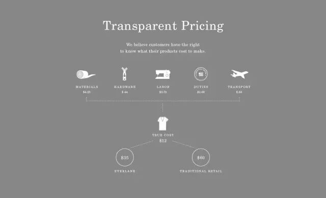 值得一提的是,Everlane在运营方面还蛮特立独行的。它把每一件商品的原材料成本、运输成本、利润、零售的差价全部清楚地列在了自家网站上。比如你看中了一件Tee,你可以看到它的成本是12美元,Everlane卖35美元,在其他零售店则要卖60美元,看到差价时仿佛有种赚到了的感觉(才不是为剁手找借口)。▼