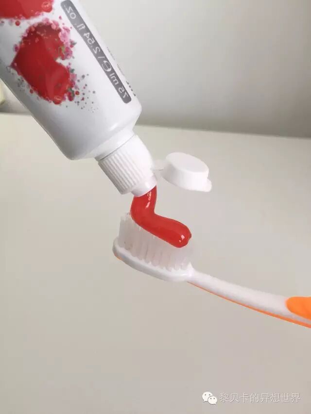 它的颜色比较特别,膏体是半透明的红色,刷牙时一嘴粉红色的泡沫。树莓香味还蛮好闻的,刷得嘴巴里甜甜的,有点像泡泡糖的味道。没有很重的薄荷味,但刷完牙嘴里也会凉凉的。▼