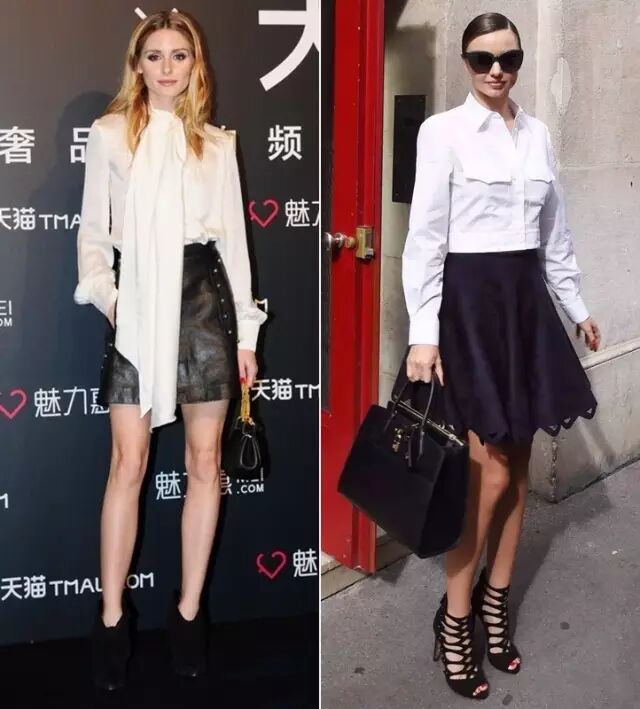 白衬衫搭黑裙子。Olivia这套比可儿搭得好,无论是上衣还是裙子设计感都要更强。▼