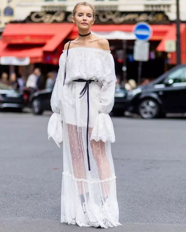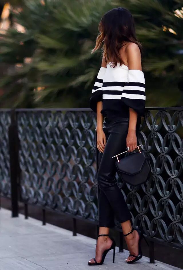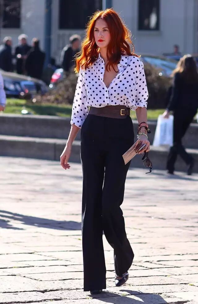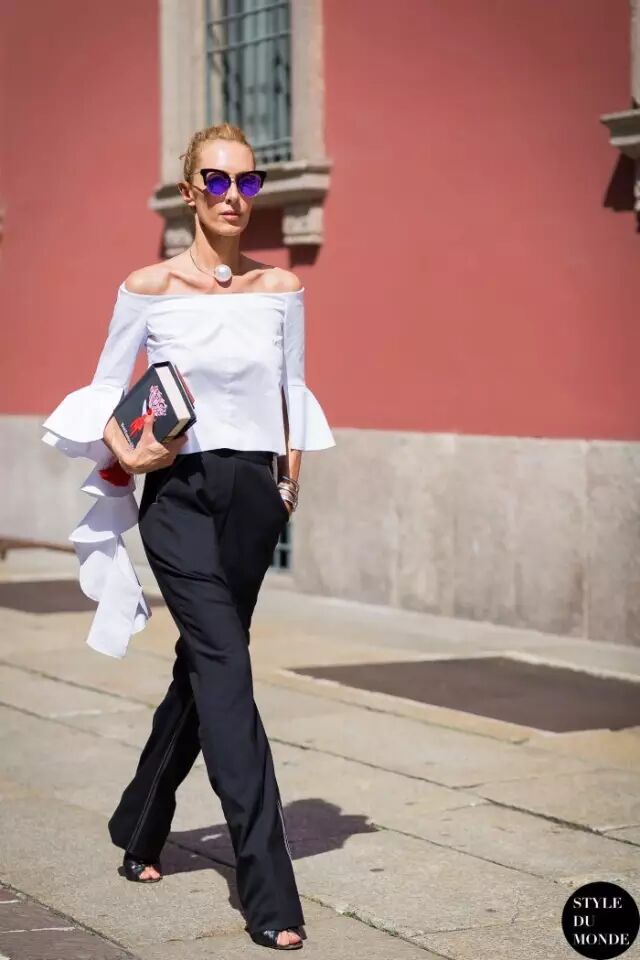 比如最典型的白衬衫搭黑裤子、黑裙子,衬衫选露肩款,时髦度立马up几个度。▼