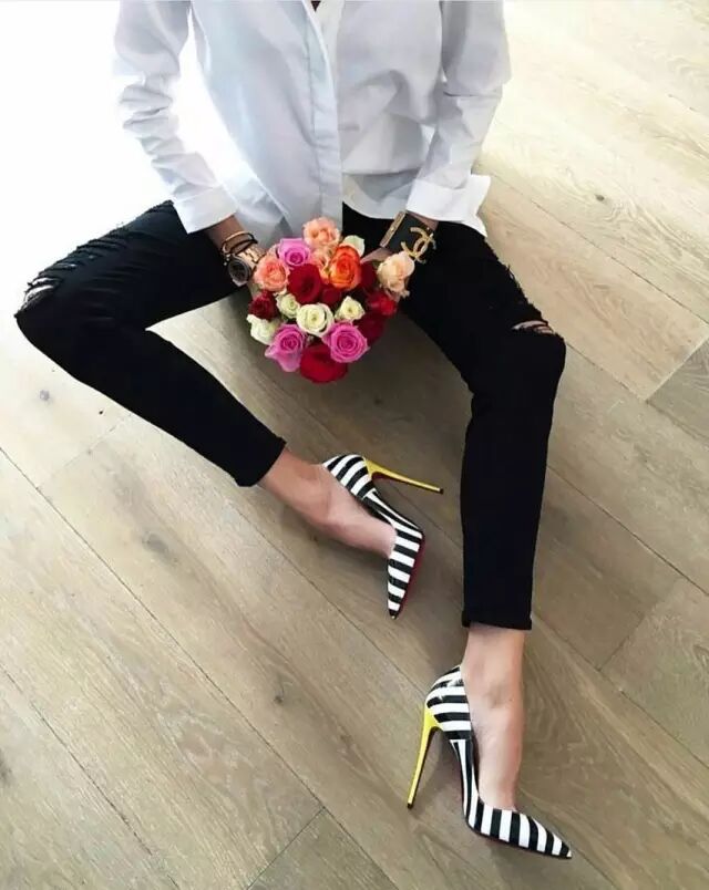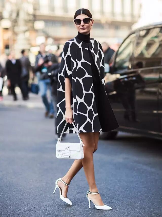 最简易提升黑白配的捷径还有一个,就是加入一个黑白配的几何单品,比如黑白配几何图案的鞋子。▼