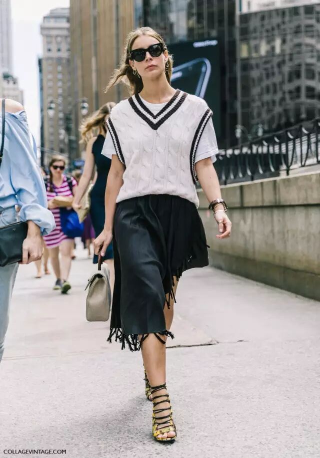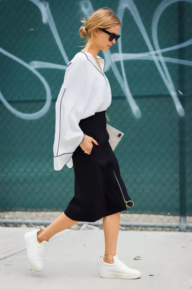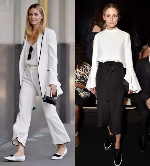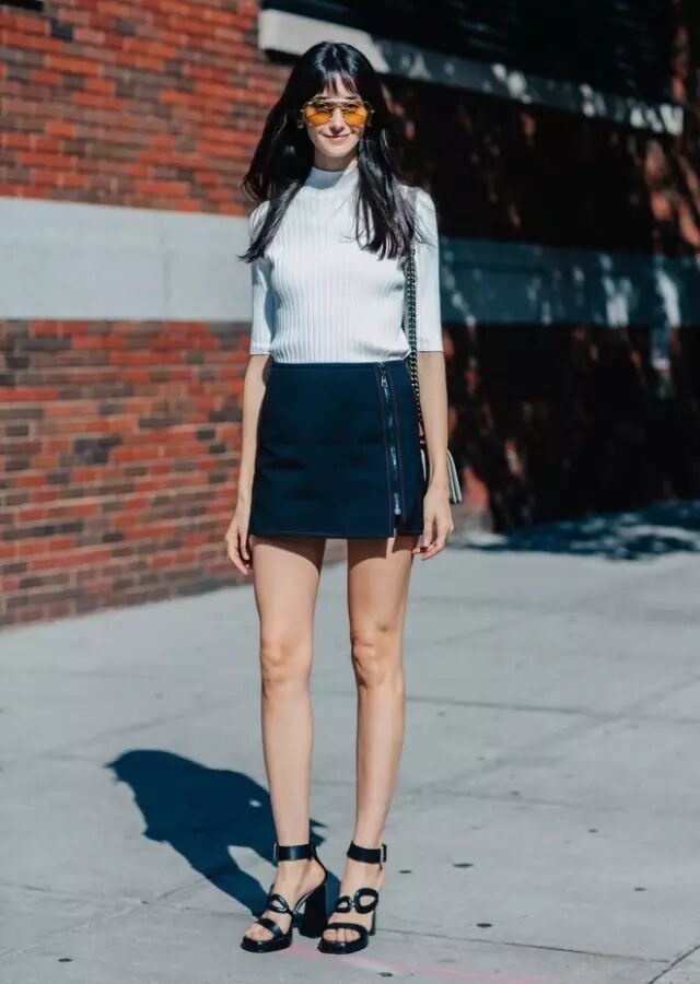 如果你有一件黑白拼色的单品,除了搭配常见的蓝色牛仔裤了,还可以试试像Olivia这样配条黑裙子,两种完全不同的风情。▼