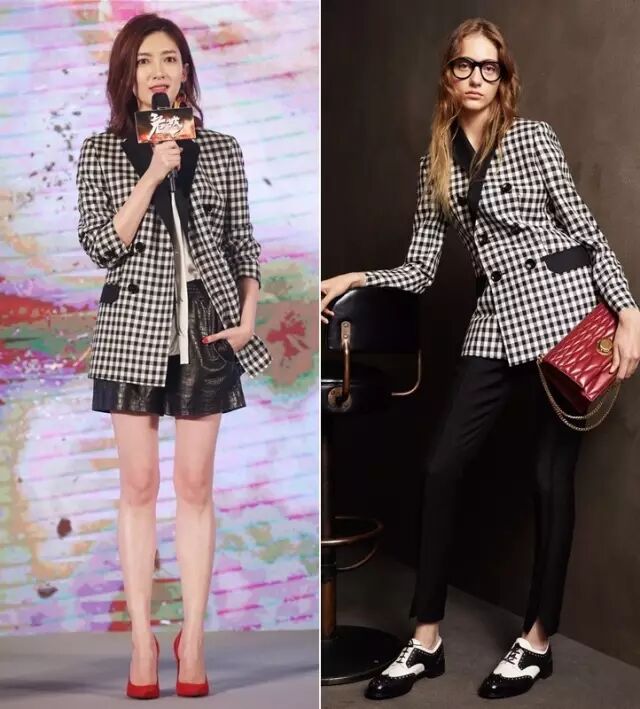 江疏影用一双红鞋来搭英伦风的黑白格纹西装,整体变得更俏皮和时髦了,比模特穿得更好看,当然了,皮短裤也占了一份功劳。▼