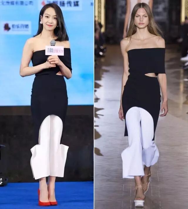 简洁的纯色黑白配也不需要过多的装饰,一双红鞋就足够点亮全身。宋茜这身就比模特更加有光彩。▼