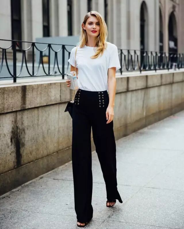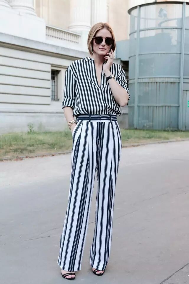 运用几何单品很容易理解,比如说像Olivia这样选择一条黑白条纹的裤子。▼