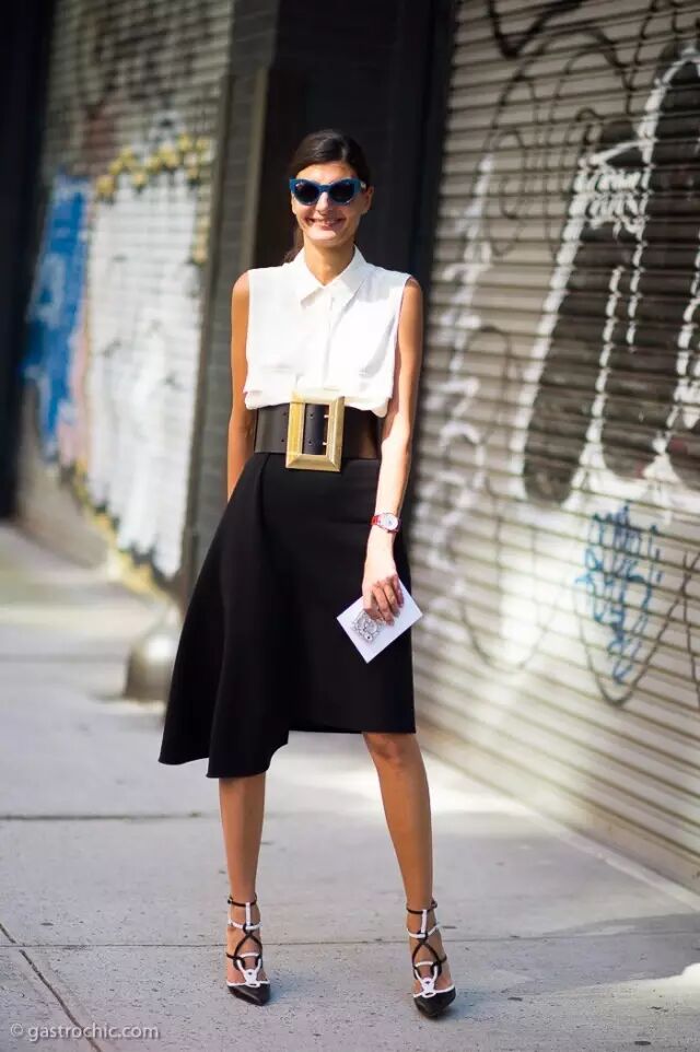 我们之前介绍过的意大利造型师Giovanna Battaglia,很多经典搭配就是黑白配 金色配饰。比如配一条金色腰带,增加造型感。▼