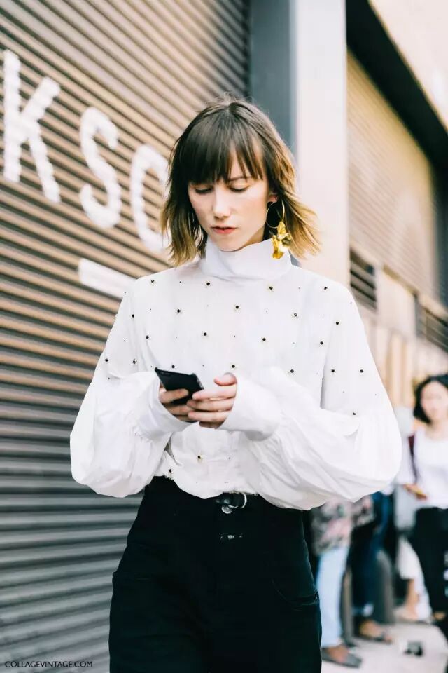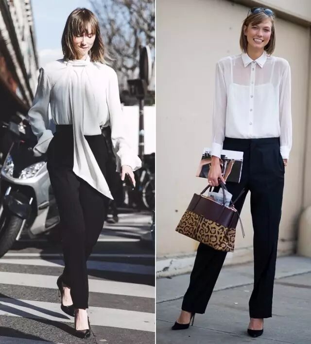 或者选蝴蝶结款式的白衬衫,是不是比基本款的搭黑裤子更时髦?▼