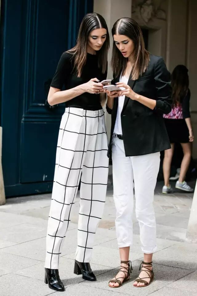 对比一下,同样是黑白配,左边穿黑白格纹裤子的女孩整体感觉就比右边的朋友要更特别一些。▼