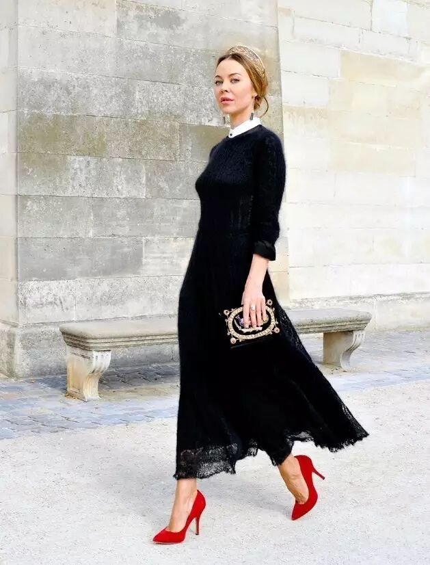 俄罗斯名媛Ulyana Sergeenko这一身,一个小小的红色耳环和红唇,就让全身看起来又精致又复古。▼