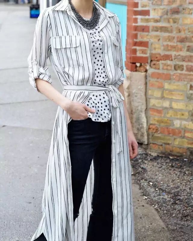 艺高人胆大的Olivia试过波点 条纹 格纹三管齐下,出奇的和谐。这身就很考验功力,要把握好每件黑白单品的图案大小、疏密程度,不然也会很容易显得繁杂。▼