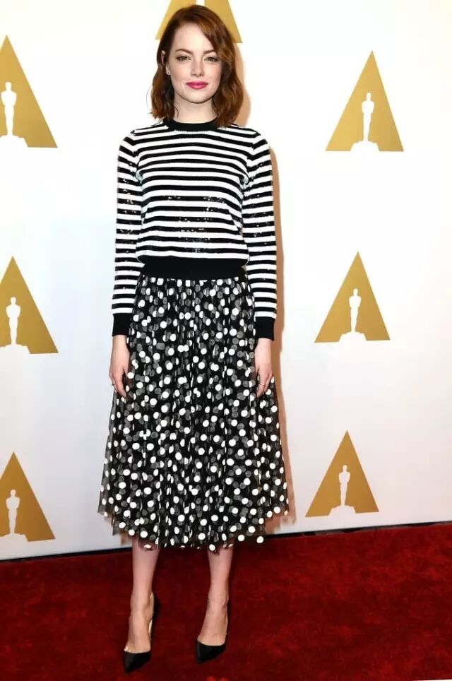 艾玛石就是这样搭,用条纹间隔相对大一点的条纹衫搭波点密集的裙子,还是蛮清爽的。▼