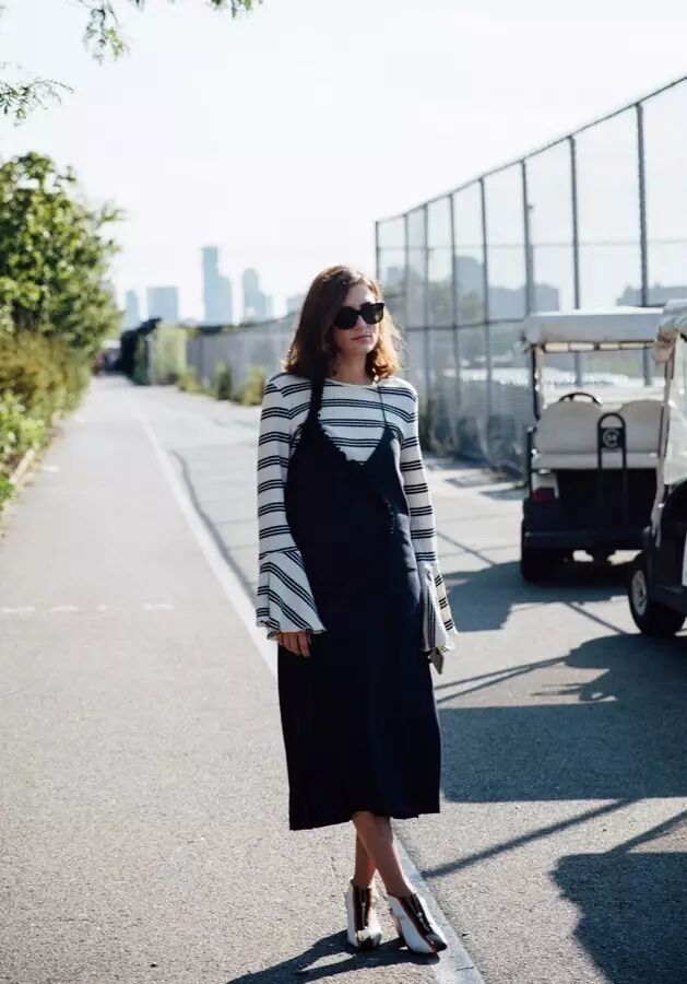 但也不是所有的袖子都会穿成“断臂女侠”。选袖长只够遮住半只手的,整体就会清爽很多。试试今年流行的搭法,把它穿在吊带连衣裙里,也挺特别的。▼