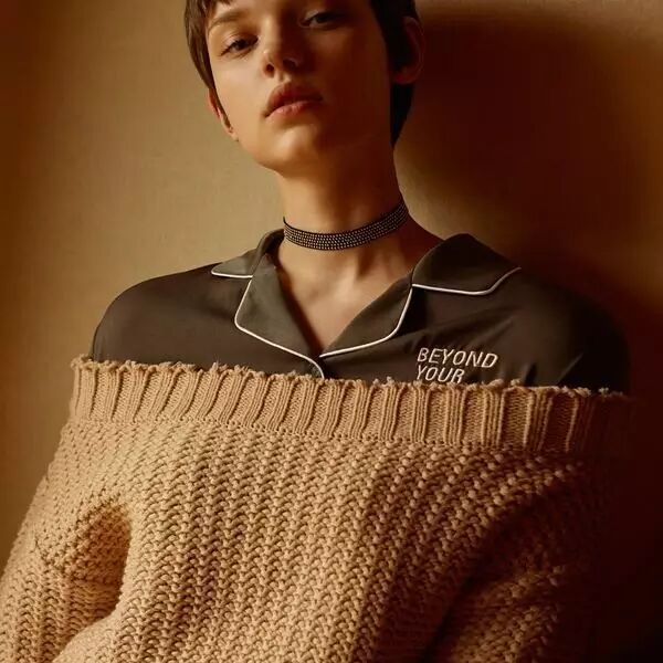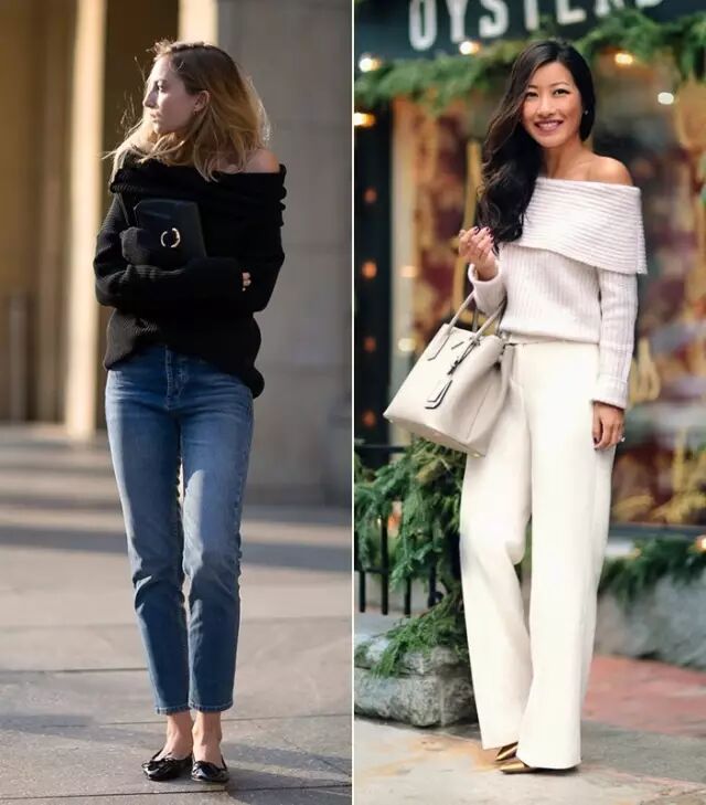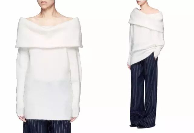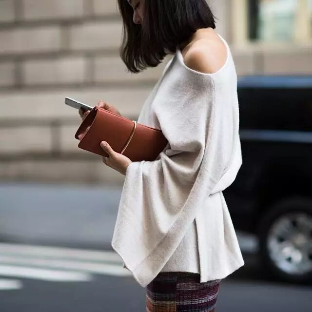 今年夏天特别流行的露肩风,也随着寒风一起刮到了针织衫上。夏天我穿过很多露肩衬衫,属于容易驾驭的小性感,不过到了秋冬,这么火的露肩针织衫,我至今还没尝试过。保暖系数太低了,秋天穿还好,寒冬中我选择狗带。▼