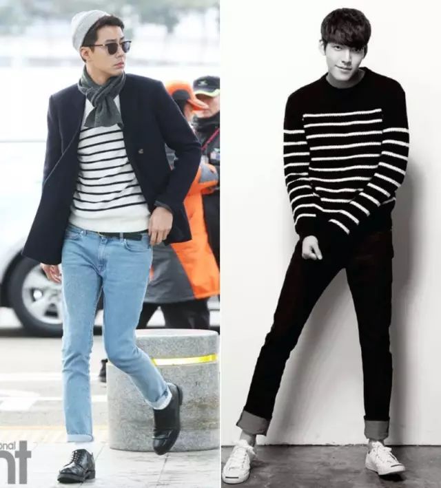 简约又不简单的还有条纹款,黑白条纹几乎不挑人,还是最好的内搭。可以像赵寅成这样搭得有趣点,也可以像金宇彬这样配个牛仔裤帆布鞋穿成邻家大男孩。▼