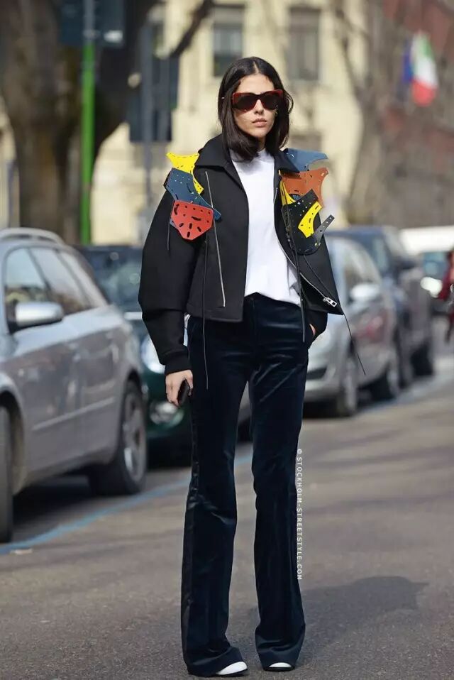 天鹅绒的裤子最近也很流行,看起来就很保暖。但要提醒的是:因为天鹅绒的反光效果和垂坠感,天鹅绒裤子会有一定程度的显胖。▼