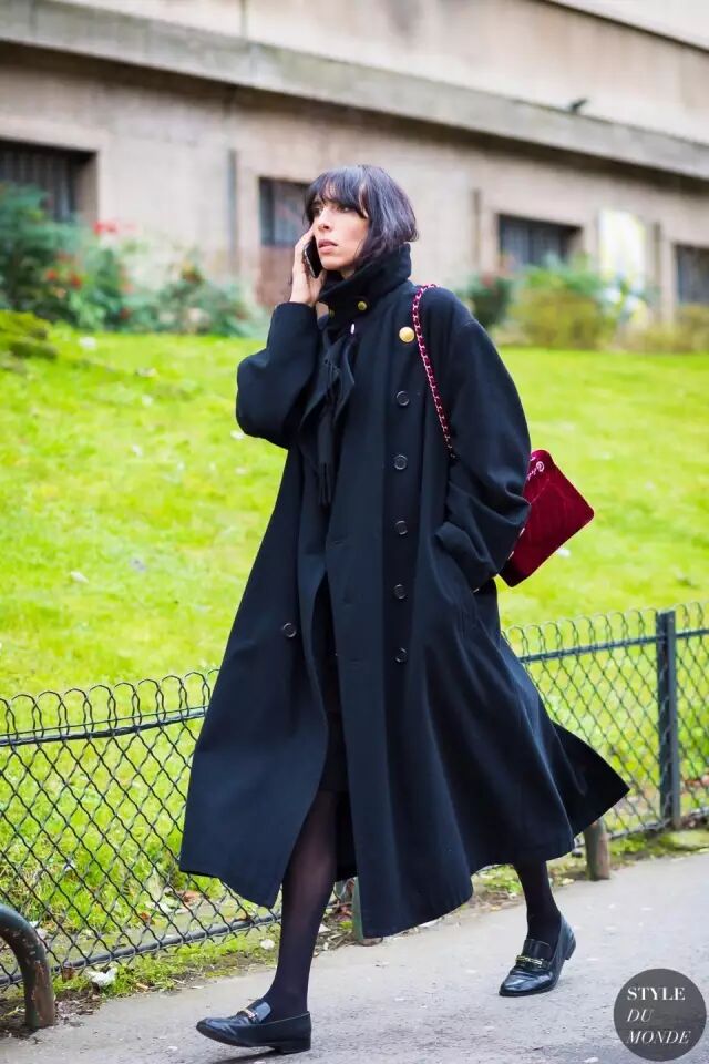 其实我觉得,背天鹅绒包包最大的好处就是:不冰手啊。毕竟,还有什么比在冬日的寒意里触摸细腻柔软的天鹅绒包包更开心的事呢?黑大衣配一个酒红色包包,超美。▼