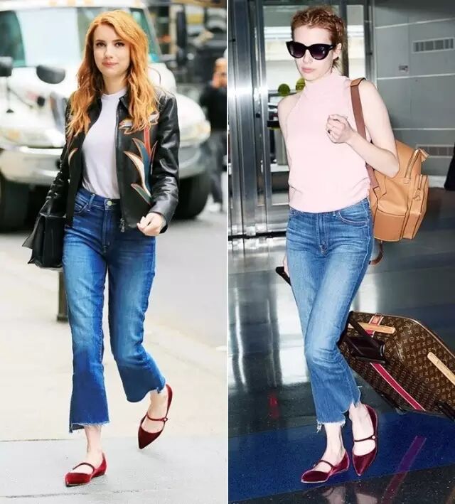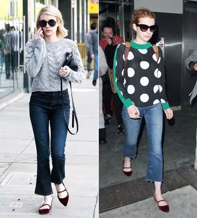 Emma Roberts穿过不少天鹅绒面料的鞋子。这双酒红色天鹅绒平底玛丽珍鞋是她今年的最爱之一,来自Tabitha Simmons。和九分喇叭裤十分搭。▼