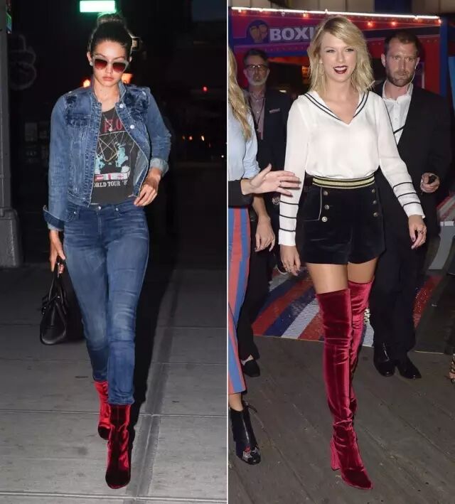 天鹅绒本身就有些小奢华,颜色过于亮丽,面积过大,容易浮夸。像霉霉的过膝长靴,存在感就有点太强了~▼