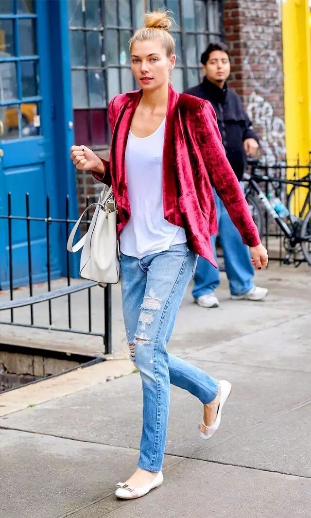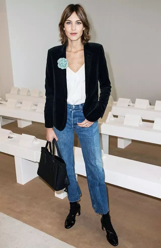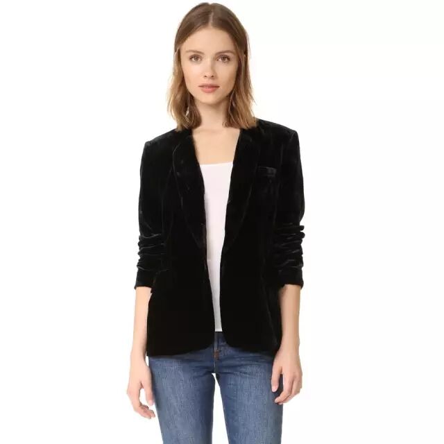 不过对于我们普通人来说,整套天鹅绒未免过于隆重。单件的天鹅绒小西装会更好驾驭,混搭简单的日常基础款就很好看。我自己也有一件,随便搭个牛仔裤白T恤就可以。▼