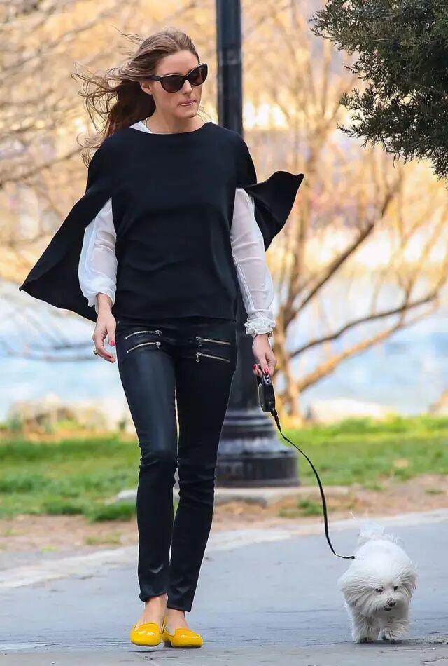吸烟鞋从英国贵族的室内起居便鞋演变而来,自诞生起就用天鹅绒作为鞋面(戳这里看吸烟鞋的科普机智|| 这些平底鞋可以穿出不输高跟的性感)。精致中带着一点帅气,非常百搭。Olivia不管出街散步还是出席活动,经常都是踩着一双天鹅绒吸烟鞋。▼