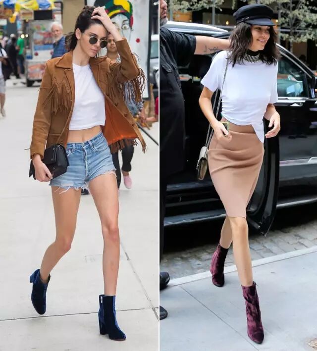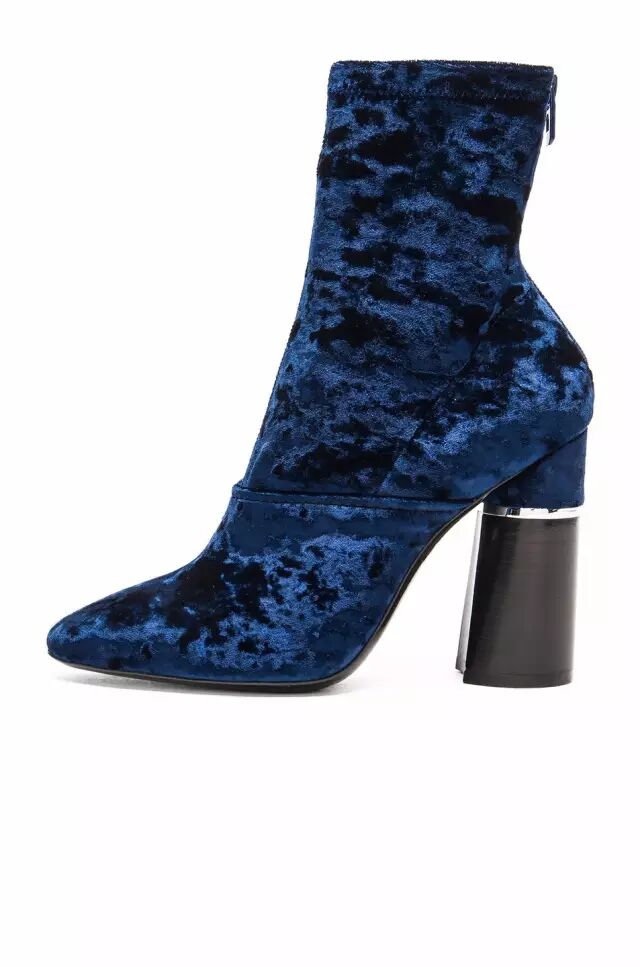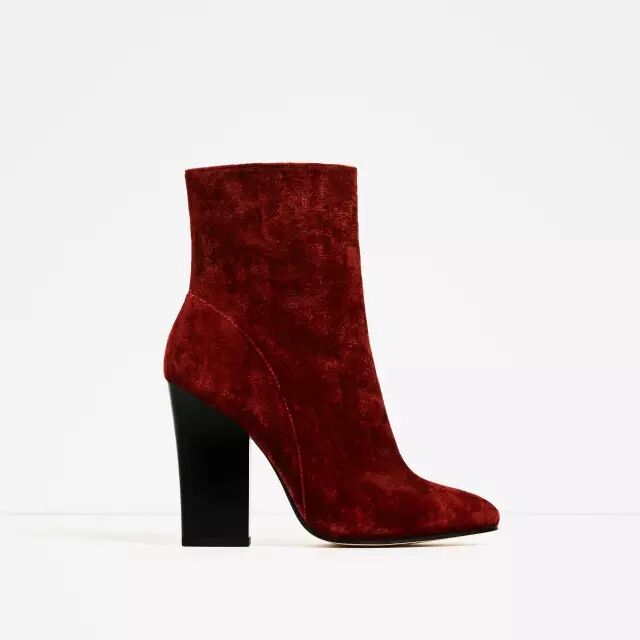天鹅绒短靴的颜色很多选,藏蓝、酒红、深紫是相对比较百搭的颜色。▼
