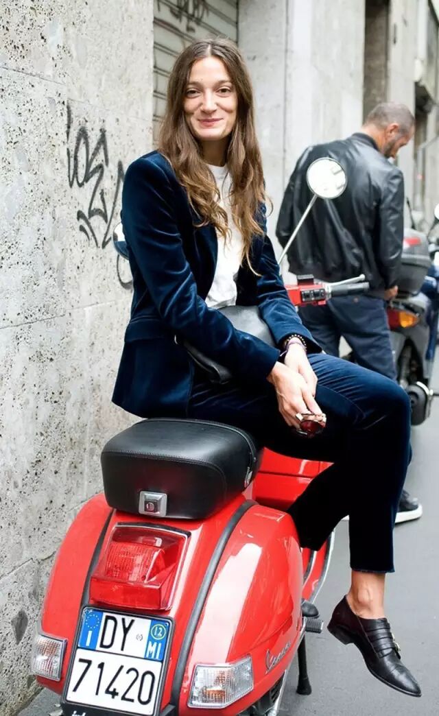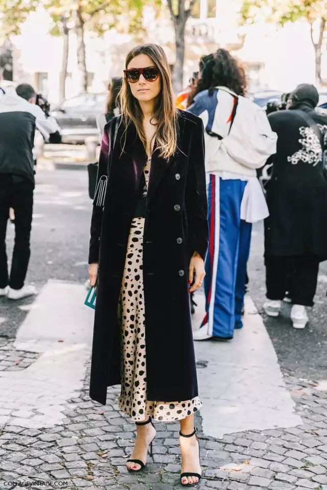 超长款这两年挺流行的,气场十足。我以前写过的意大利美人(链接戳:同样是意大利美女,她可比宇宙博主会穿多了)时装周穿了一件蓝色的天鹅绒拖地大衣,搭配的天鹅绒拖鞋增加慵懒感。▼