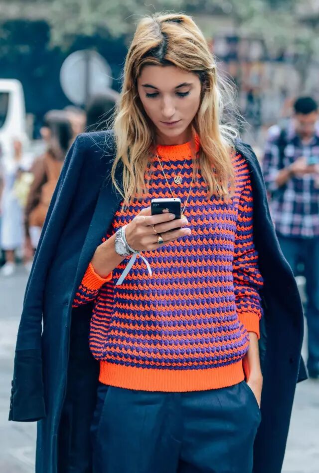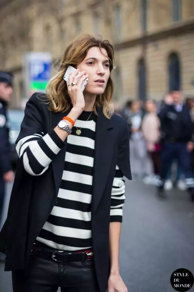 普通的黑白、蓝白条纹毛衣当然很经典,把它穿在任何外套里面做内搭都不违和。▼