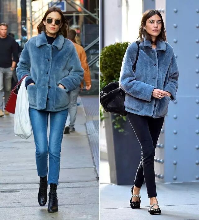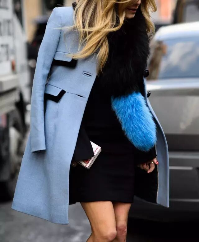 一些毛毛外套配上温柔的雾霾蓝同样不容易给人臃肿的感觉。钟小姐这件雾霾蓝的外套穿过好几次。▼