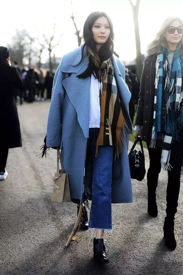 肤色暗黄的姑娘可能担心雾霾蓝不怎么衬肤色。不过解决方法也很简单,系上一条提亮肤色的围巾就完美解决了。▼