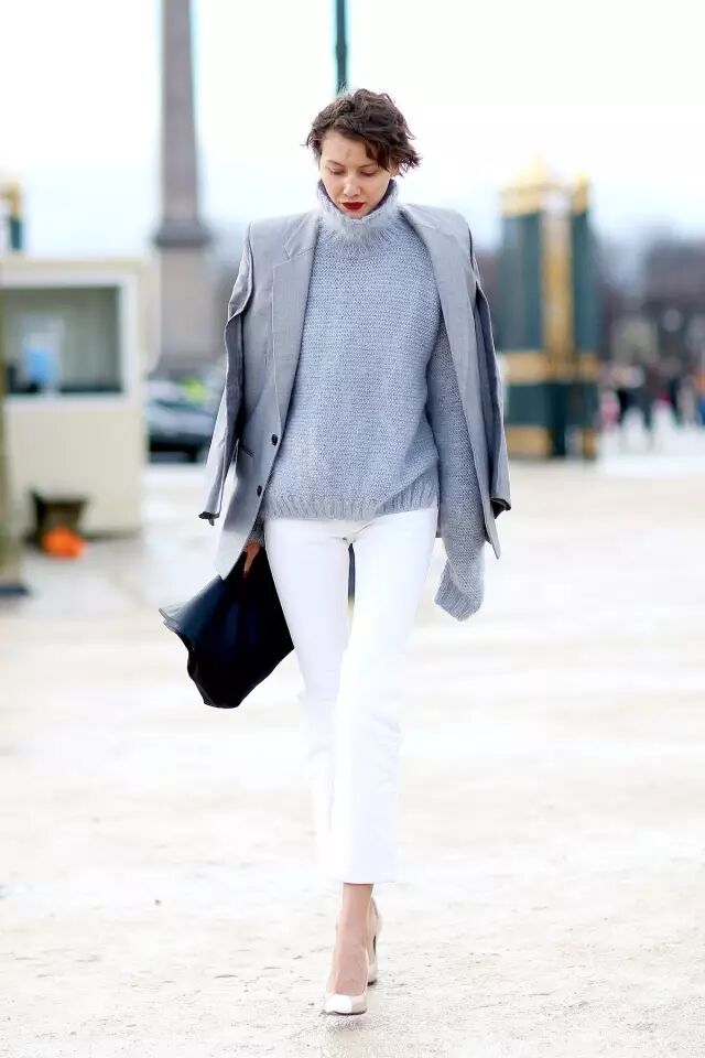 还是很好的内搭。浅色一点的雾霾蓝毛衣搭配白裤子很清新,一扫冬日的沉闷。踩上一双高跟鞋,摩登又优雅。▼