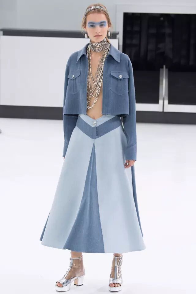 还可以试试这两年很流行的全身一个色的搭配法则,深浅不一的蓝色搭配出层次感和时髦感。这是Chanel的秀场Look,虽然是短外套,但配色思路很值得学习。▼