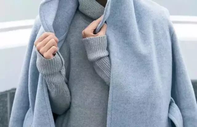 雾霾蓝大衣本身就带点灰色调,和灰色毛衣配起来很温柔。▼