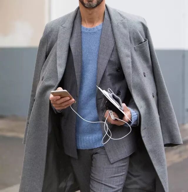男士的深色衣服里搭配一件雾霾蓝毛衣,清爽不失沉静。▼