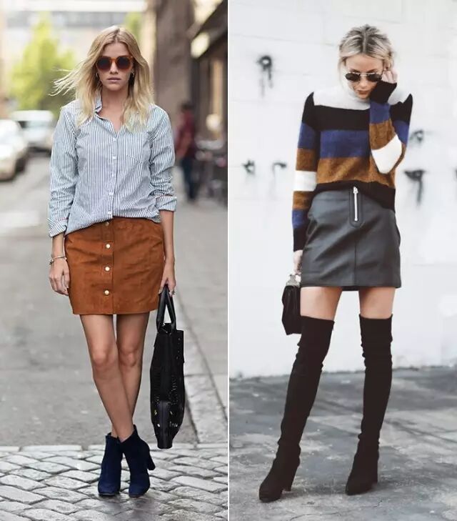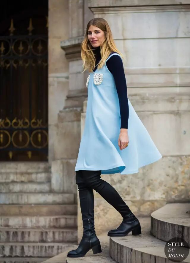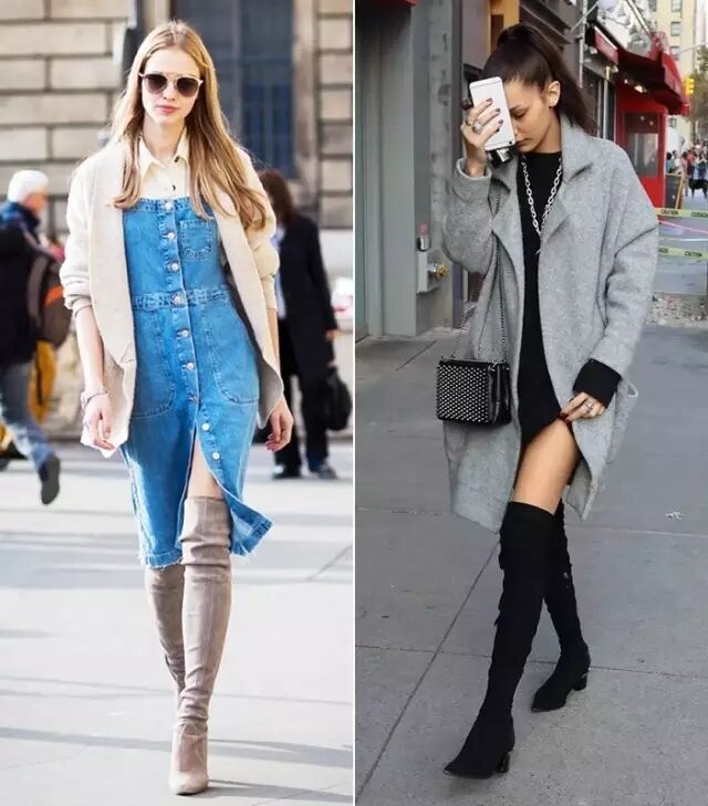 怕冷的小伙伴就直接用更长一点的半裙或迷笛裙来搭配过膝靴。这两年还蛮流行这种穿法的,不过拉长比例的效果就没那么明显了。▼