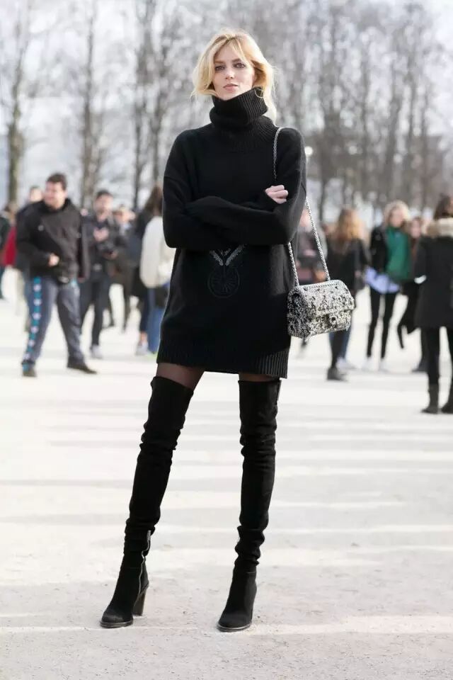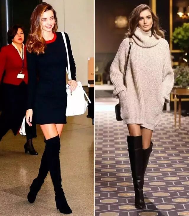 大毛衣、长一点的针织裙、性感的开叉裙,和过膝靴都是绝配。▼