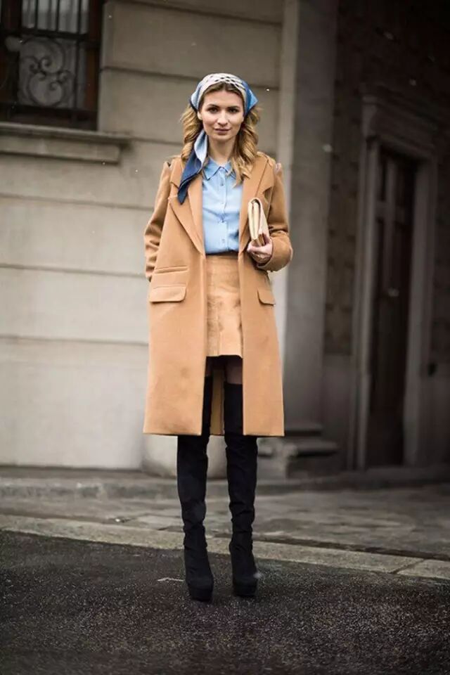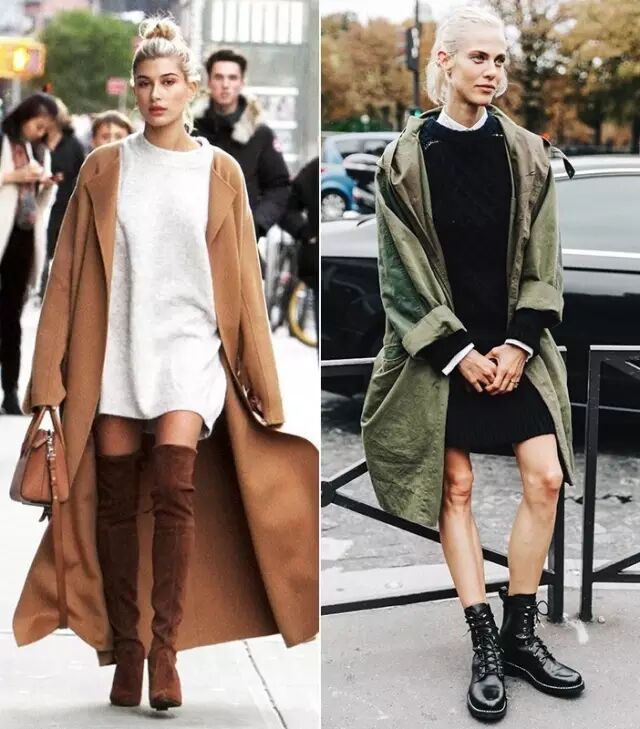 不用露腿,上半身还可以穿一件连衣裙,长度足够遮住过膝靴,外面再套一件长大衣。觉得还不够暖的里面还可以穿保暖衣或者贴暖宝宝啊~▼