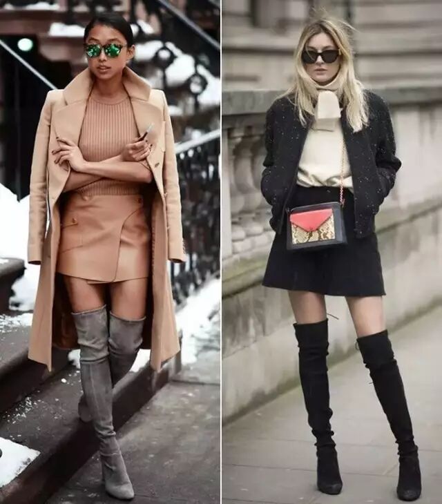小短裙也都可以搭过膝靴。不过我觉得包臀一点的会比A字的更显腿长。▼