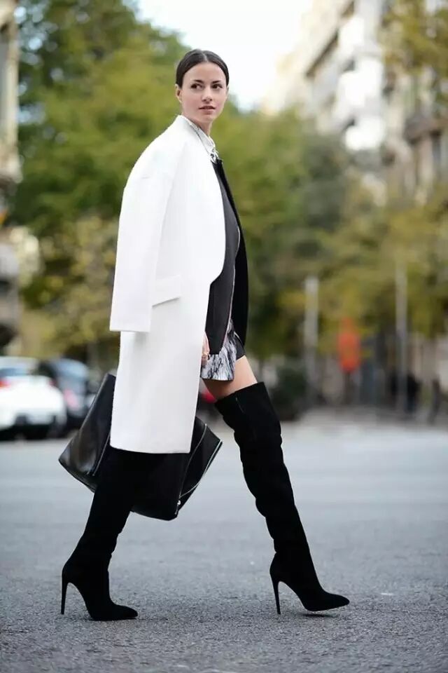 因为过膝靴的存在感比较大,所以最好选纯色款的,简洁利落,不会过分抢眼,也不容易出错。黑色是首选。▼