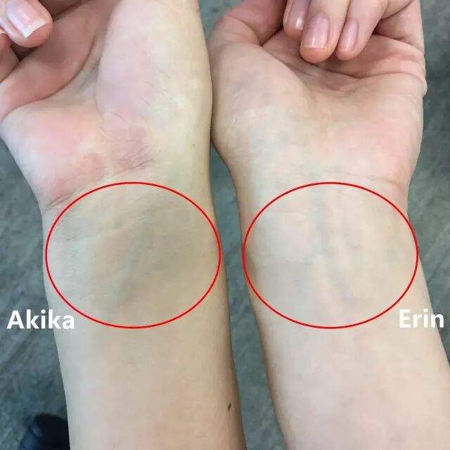 看助理小妞的示范,拍出来很明显,Erin是冷皮,Akika是暖皮。▼