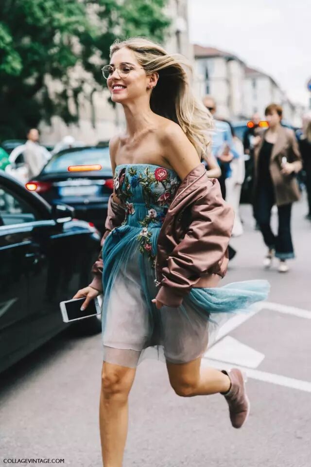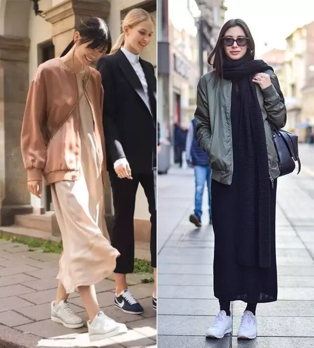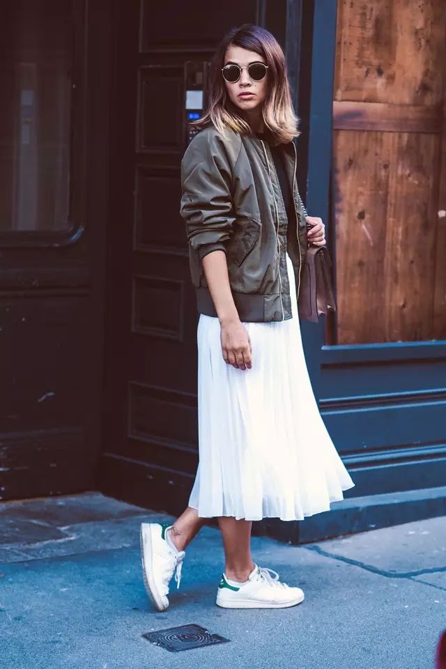 普通款飞行员夹克搭迷笛裙也不会违和,配上白色的百褶裙还蛮清新的。但鞋子最好选休闲感强的小白鞋小短靴之类。▼