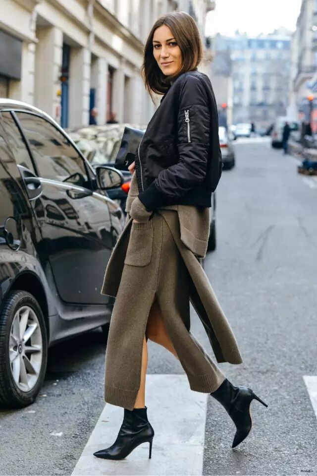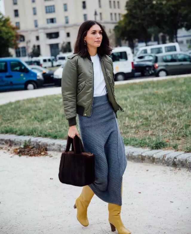 针织套裙外面也可以考虑穿一件飞行员夹克,不同材质相碰撞。▼
