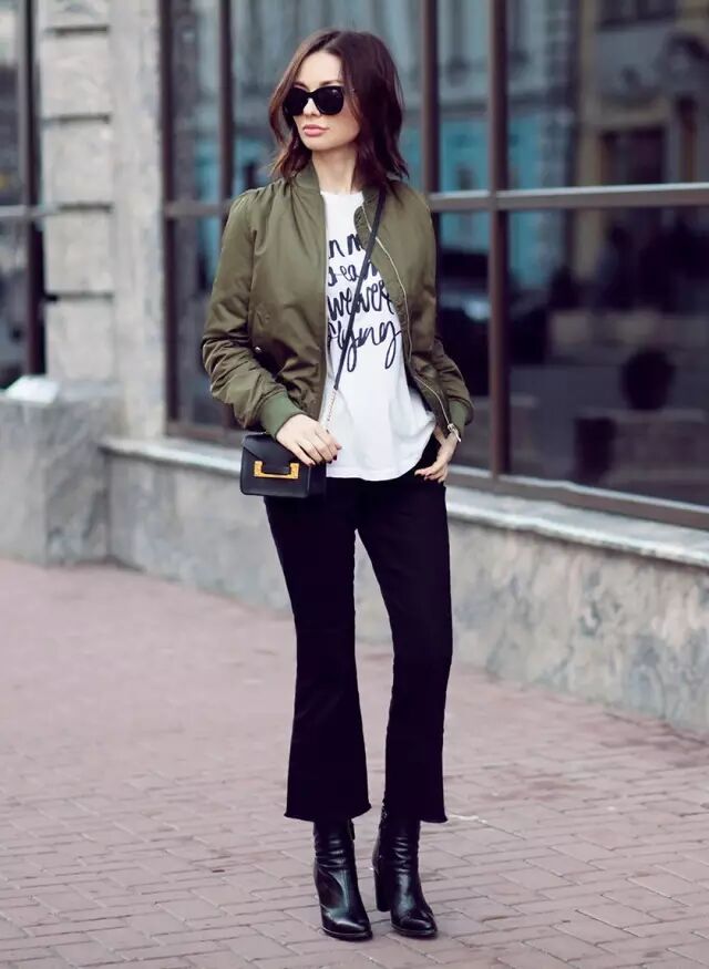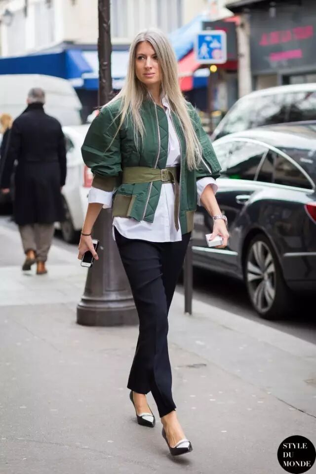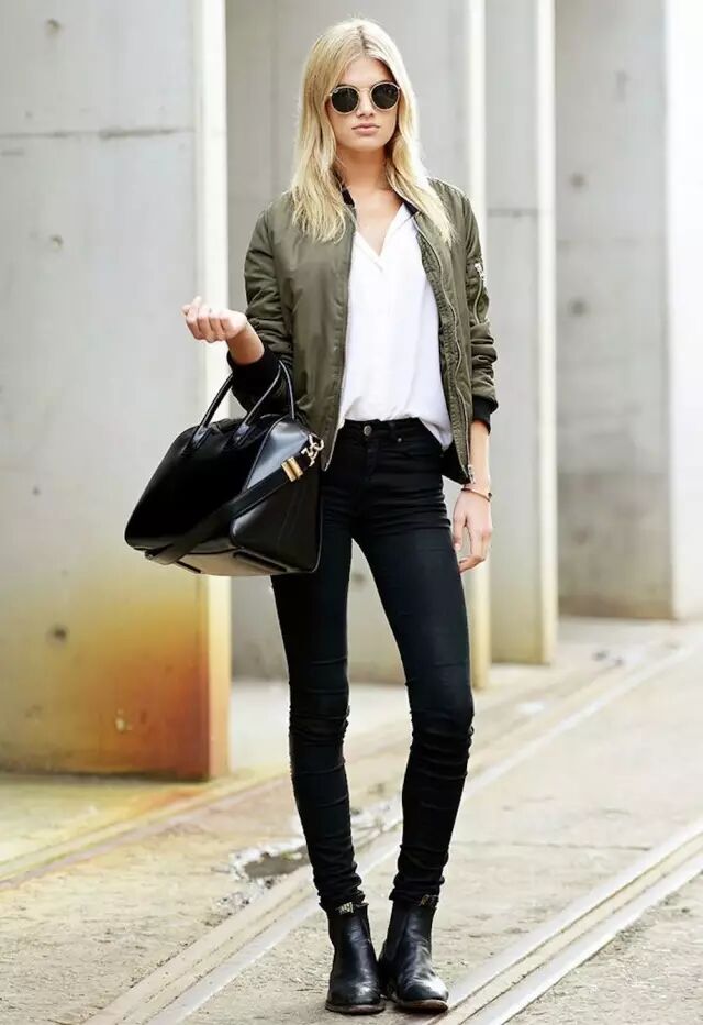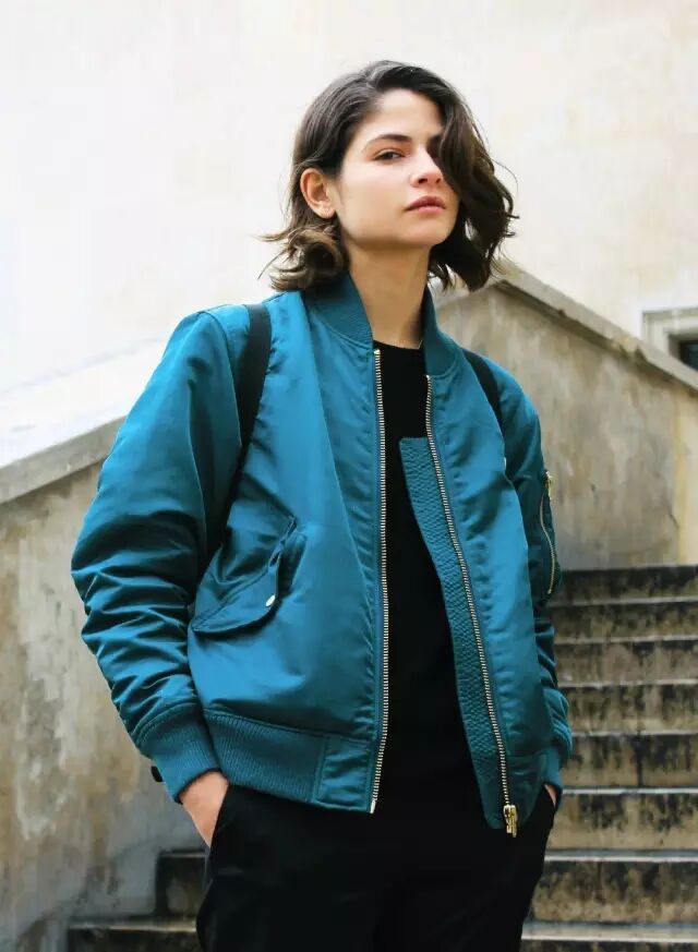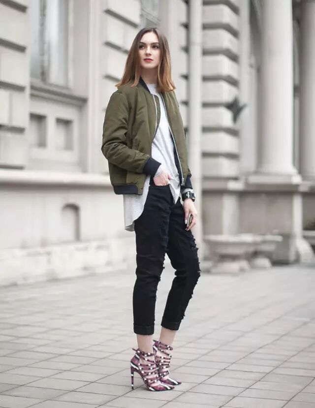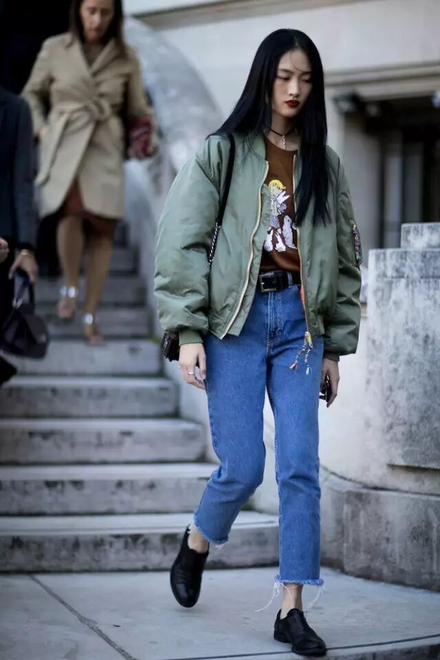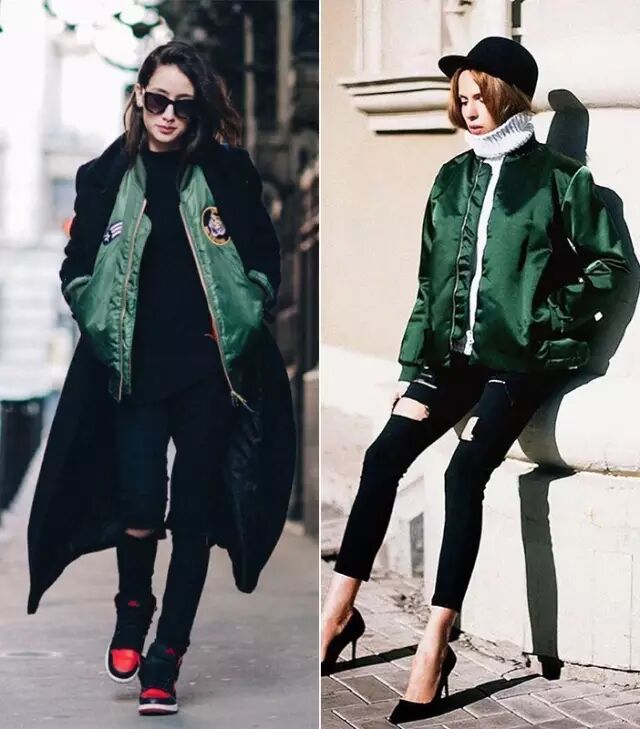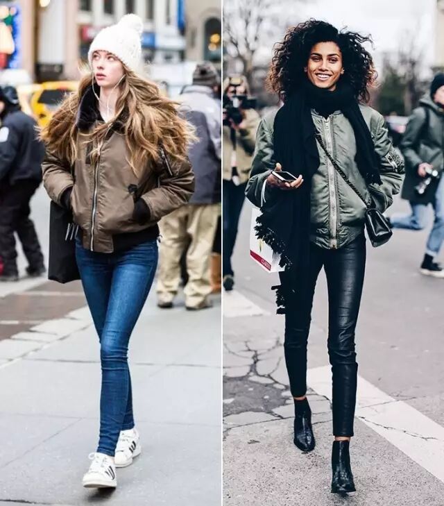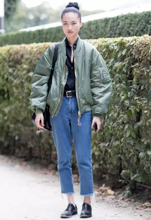 因为飞行员夹克比较蓬,很多人一拿起它,总会忍不住搭配紧身裤,打造上松下紧的效果,做个cool girl。其实,